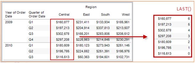 Returns the number of rows from the current row to the last row in the partition. For example, the table below shows quarterly sales. When LAST() is computed within the Date partition, the offset of